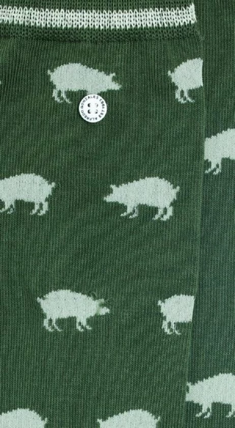 De Notorious Pig Socks zijn hippe sokken van Alfredo Gonzales. De sokken zijn gemaakt van katoen. Aan de bovenzijde bevindt zich een band met elastiek. Hierdoor wordt voorkomen dat de sokken makkelijk gaan afzakken. Op de sokken staan varkens afgebeeld. Door de groene kleur van de sokken, lijkt het net of de varkens in het gras staan. De Notorious Pig Socks zijn de perfecte sokken voor dierenliefhebbers.Maatvoering:- x-small: schoenmaat 35-37- small: schoenmaat 38-41- medium: schoenmaat 42-45- large: schoenmaat 46-48