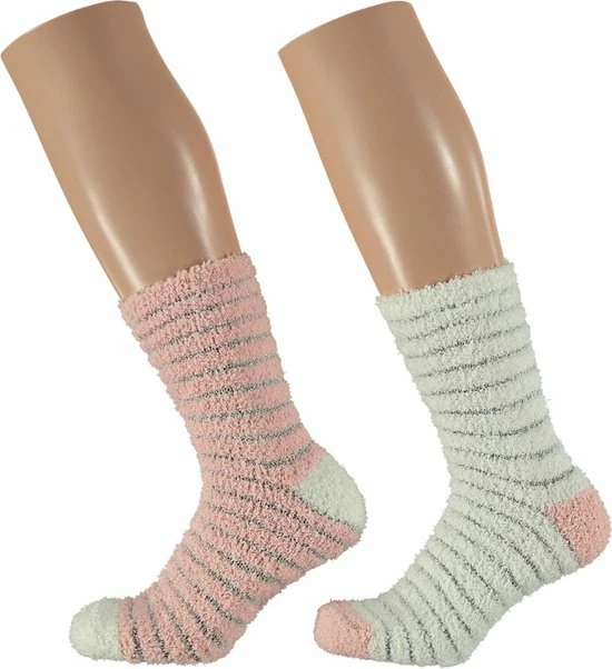 2-Pak dames soft-touch fluffy bedsokken/huissokken roze/wit maat 36-41. 2 paar warme zachte sokken, ideaal om te dragen in bed of op de bank. Let op: De sokken hebben geen anti-slip zool. Materiaal: 92% polyester en 8% elasthan.
