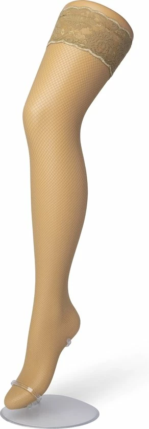 Mooie fijne FISHNET Hold up met brede band voorzien van hoge kwaliteit siliconen randen. 78% polyamide, 22% elastaneTips voor het dragen en wassen van hold-upsHold up panty’s zijn zelf-ophoudende panty’s zonder broekje. Deze hebben aan de bovenkant een elastische band waarin siliconen randen zijn verwerkt , deze randen plakken op de bovenbenen Door deze siliconenrand blijven de kousen aan het bovenbenen ‘plakken’. * Trek je hold-up goed, sla de band terug, de siliconen randen zijn nu zichtbaar.Ga met een in warm water gedompeld washandje over de siliconen randen heen, Je maakt ze nu schoon en warm, hierdoor wordt de siliconen week en blijft de hold up perfec aan het been โplakkenโ. Bij dragen zal door de lichaamstemperatuur de hold up blijven โplakkenโ . * Gebruik GEEN bodylotion, (bad) olie, of creme wanneer je hold-ups gaat dragen. Wanneer je dit wel gebruikt maakt dit de siliconen rand van de holdup glad en ze zullen hierdoor van het been afzakken. * Was je hold ups in lauw warm of koud water, anders verliest de siliconen band kracht. * Gebruik van wasverzachter wordt ook ontraden, dit kan het elastane beschadigen en de hold up zal zijn rek verliezen.