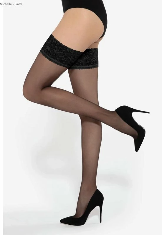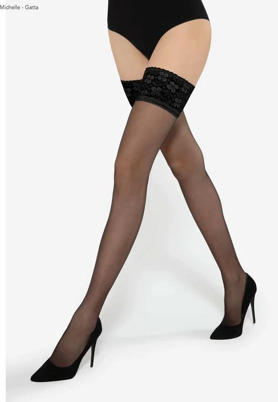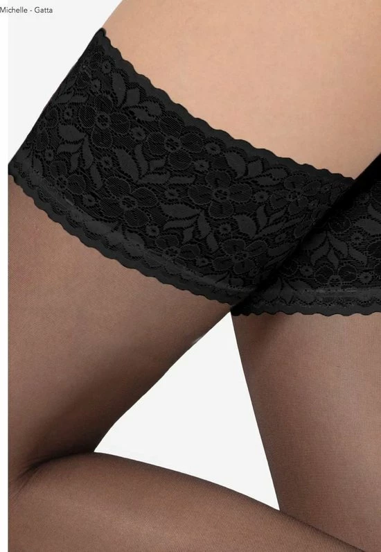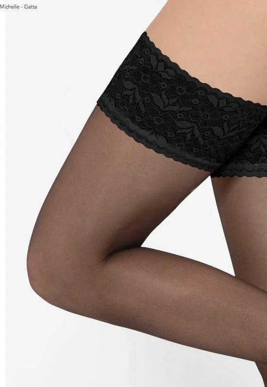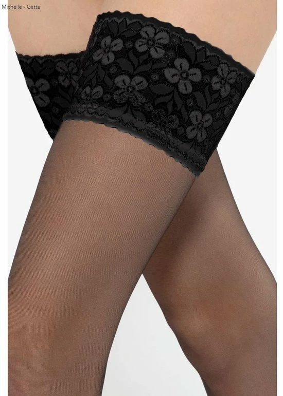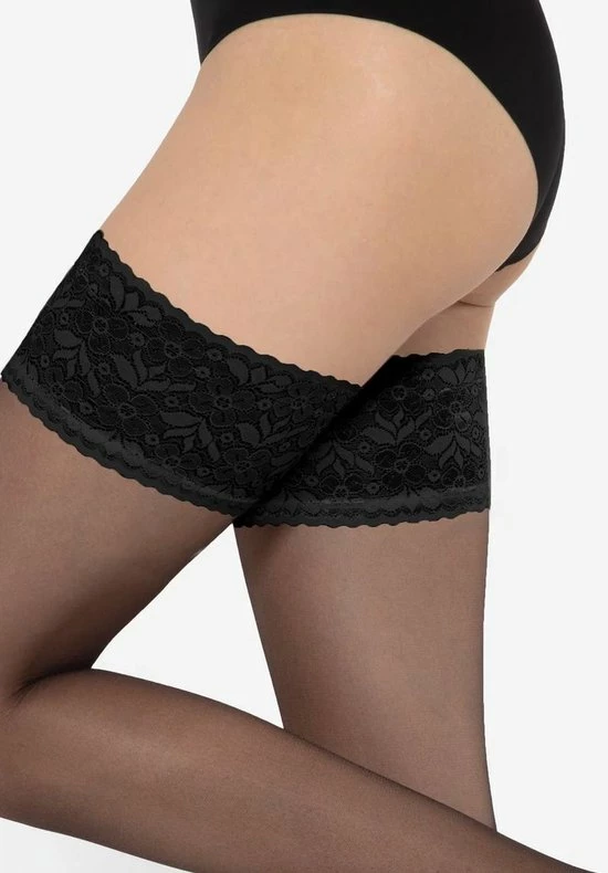Hold Up kousen in transparante matte van 20 denier- kwaliteit. Gemaakt van lycra garen met zachte kanten boord met brede rand in het zwart. De kousen hebben een siliconenrand waardoor ze mooi blijven zitten. De kous beschikt over een hoog draagcomfort zonder versterkt teengedeelte.