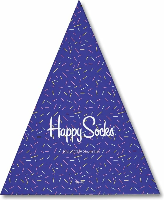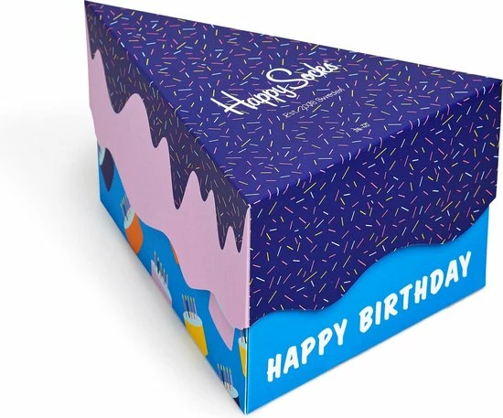 Wie er ook jarig is, deze Happy Birthday Gift Box zal gegarandeerd in de smaak vallen! De paarse gift box heeft de vorm van een heerlijk stuk verjaardagstaart, met roze versiering. De drie kleurige sokontwerpen zijn voorzien van vlaggen, verjaardagstaarten en confetti – allemaal speelse patronen die bij zowel jarige dames als heren een glimlach op het gezicht zal toveren!