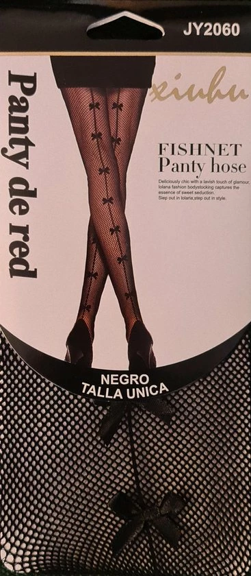 Deze netpanty heeft een smal visnet patroon en valt high waist. Aan de achterkant hebben beide benen over de gehele lengte een zwarte streep en daarop zwart strikjes.
