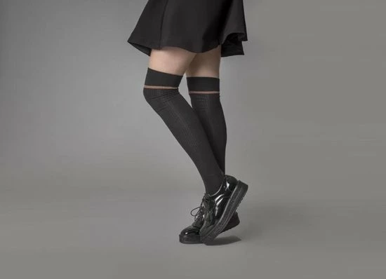 Mooi luxe overknee kousen Nadine van MarcMarcs, Je hebt ze vast al wel gezien in het modebeeld van dit seizoen. Overknee kousen staan origineel én zijn ook nog eens lekker warm. Dit paar van kwaliteitsmerk MarcMarcs zijn zwart met een beetje bling. De streep op het bovenbeen is goudkleurig en door het gebruik van metallic garen glanst het prachtig.
