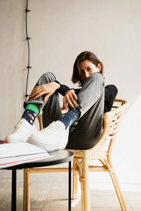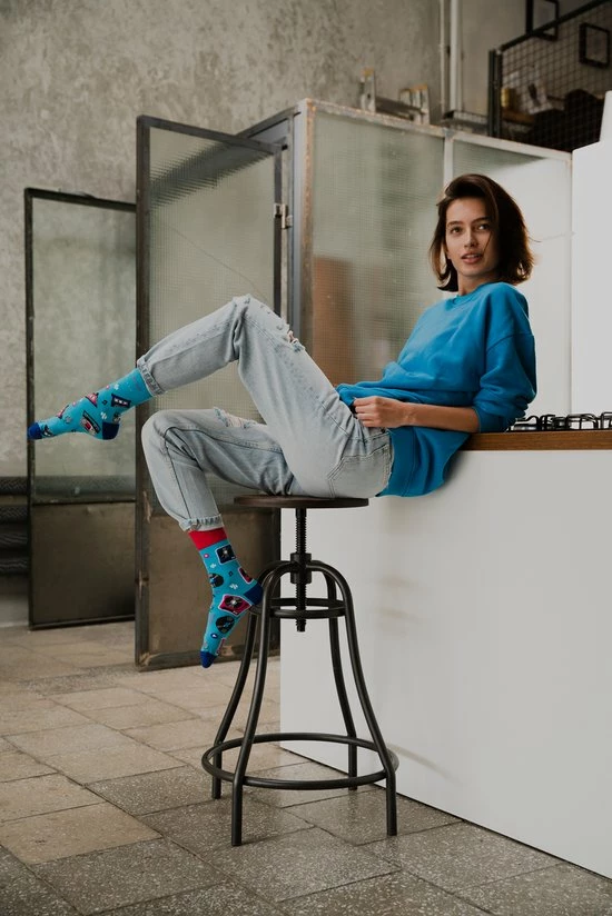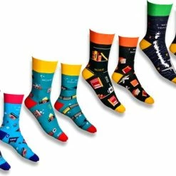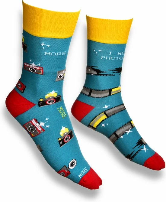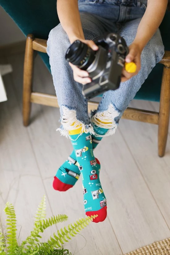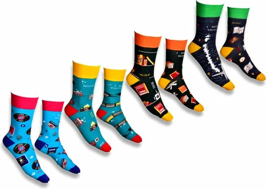 Een set van 4 paar dames sokken met een bijzondere print die verwijst naar hobby (fotografie, boeken, reizen en muziek) – Maat 35/38 – Hoogste kwaliteit – 100% vervaardigd in de EU