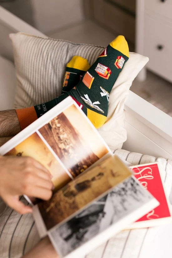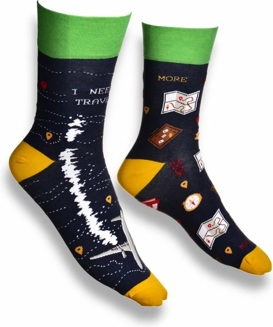 De sokken hebben een asymmetrische print, wat met andere woorden betekent dat de linker sok anders is dan de rechter, maar ze passen net zo goed bij elkaar als een camera tot een fotografische film, een cassetteband tot een cassettenspeler, een verloren bagage tot de luchthaven en een goed misdaadboek tot Harlan Coben.