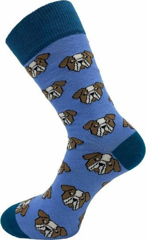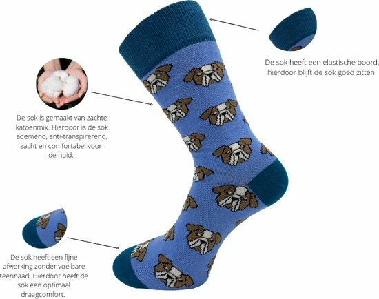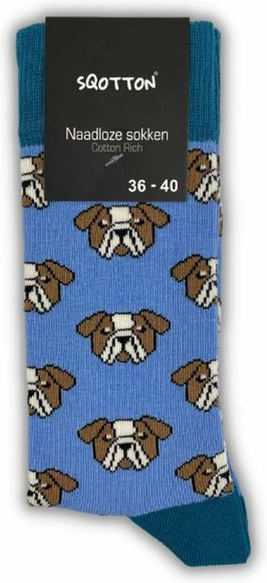 Vrolijke SQOTTON sokken met hondenhoofd print. Deze naadloze sokken met print hebben een hoog draagcomfort en zijn daarom ideaal voor dagelijks gebruik. De sokken zijn gemaakt van een zachte katoenmix. Hierdoor zijn de sokken ademend, anti-transpirerend en comfortabel voor je huid. De sokken hebben een elastische boord waardoor de sokken goed blijven zitten. Daarbij hebben deze vrolijke sokken een handgekettelde afwerking zonder voelbare naad bovenop de tenen. Een afwerking zoals deze wordt ook wel naadloos genoemd. Deze naadloze sokken met print zijn unisex, geschikt voor zowel dames als heren. De sokken worden per paar geleverd verkrijgbaar in de maten 36-40 en 41-46.