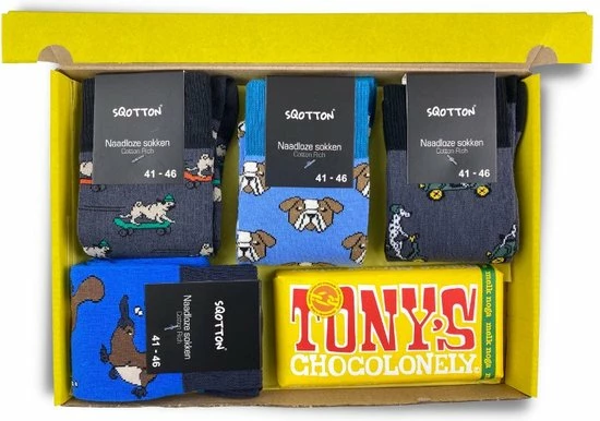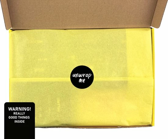 Leuke brievenbus cadeaubox in de kleur geel met sluitsticker in de tekst ‘’Warning really good things inside” speciaal voor jou alvast ingepakt. In het cadeaudoosje vind je een lekkere chocolade van Tony’s Chocolonely reep en een set van 4 paar vrolijke printsokken. Dit allerleukste geschenkdoosje zal meer dan voldoen aan je zoektochten. Vooral als je het moeilijk vindt om een leuk cadeautje te vinden voor je vrienden, familie of geliefden. Dit speciale cadeau met vrolijke sokken is geschikt voor zowel dames als voor heren. Verstuur dit brievenbus giftbox als felicitatie, bedankje, beterschap of zomaar. Een feestje door de brievenbus zonder dat de ontvanger thuis hoeft te zijn, want onze brievenbusdozen passen door elke brievenbus superhandig. De sokken zijn verkrijgbaar in maat 36-40 en 41-46.