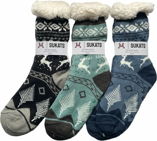 Heb jij ook altijd last van koude voeten en ben jij op zoek naar comfortabele huissokken? Dan hoef je niet verder te zoeken. Deze set van 3 paar huissokken voorziet in die wens. De met pluche gevoerde winter sokken van Sukats zijn heerlijk zacht en zorgen ervoor dat je warme voeten krijgt zonder dat ze gaan zweten. Dat komt omdat het niet van wol gemaakt is maar van acryl. De fleecevoering laten je voeten ademen in tegenstelling tot bij de traditionele huissokken.