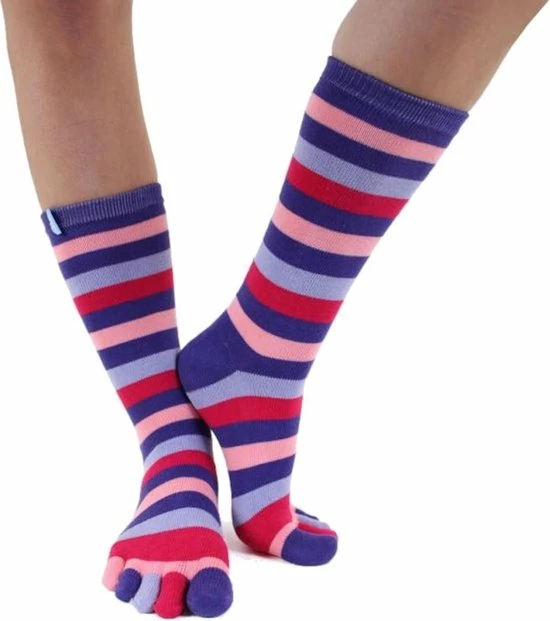 Kleuren zijn onze passie. Ze zijn levendig, harmonieus, mooi en al met al heel spannend! Vrolijke kleuren voor gelukkiger voeten. Stel je de vrije en beweeglijke tenen voor met fantastische kleurencombinaties. Ze zijn ideaal voor elke gelegenheid, van het dragen op kantoor voor hard werken tot het nonchalant thuis dragen voor een ontspannen dag. TOETOE® sokken brengen je gewoon in een goed humeur wanneer je ze draagt, wanneer je ernaar kijkt. Geen enkele andere sokken kunnen dat. Conventionele sokken zorgen ervoor dat vocht zich tussen je tenen ophoopt, waardoor een ideale omgeving ontstaat voor bacteriën en schimmels om te gedijen; dat is de hoofdoorzaak van die gênante voetengeur. Door de tenen individueel te scheiden, verminderen TOETOE® sokken de vochtophoping waardoor het probleem wordt verholpen. Deze uniseks teensokken, geschikt voor mannen en vrouwen, zijn extreem rekbaar gemaakt om een perfecte pasvorm te garanderen tussen de maten 36-46. Met TOETOE® Everyday Crew Gestreepte teensokken profiteert u van vele voordelen: * Naadloze constructie – Naadloze brei technologie zorgt voor een zachte grip zonder beperking * Blarenpreventie – Helpt blaren te voorkomen omdat er geen wrijving is tussen de tenen * Bevordert een betere hygiëne – Door de factoren van bacteriegroei (warmte, vocht, vuil) te beheersen, slechte geur te voorkomen, voetschimmel en zo de voet fris te houden * Continu teenbewegingspatroon – Handhaaft een constante bloedcirculatie en zorgt voor optimale warmte in de tenen * Teenscheiding – Stimuleert teenoefeningen die ze in hun natuurlijke vorm houden Van de hiel tot het board is 22 cm. TOETOE®: De sokken die Moeder Natuur zou ontwerpen.