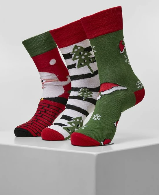Drie paar kuithoge voetjes bieden het gevoel van de authentieke kerstsfeer, afkomstig van de kleuren groen, rood, wit en zwart en de bijpassende kerstmotieven: kerstmutsen, sneeuwvlokken, een kerstmanportret en dennenbomen. De elastische ribmanchetten en de teen- en hielzones zijn geaccentueerd in kleur. De geslaagde kerst footsies van Urban Classics zijn verkrijgbaar in vier verschillende maten en zijn gemaakt van katoen, polyester en elastaan.